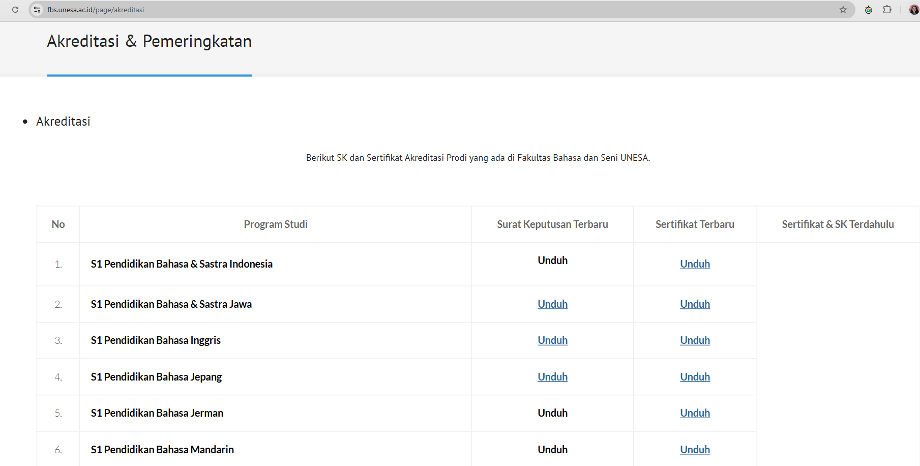 Laman resmi Fakultas Bahasa dan Seni (FBS) Universitas Negeri Surabaya (UNESA) menyediakan infor