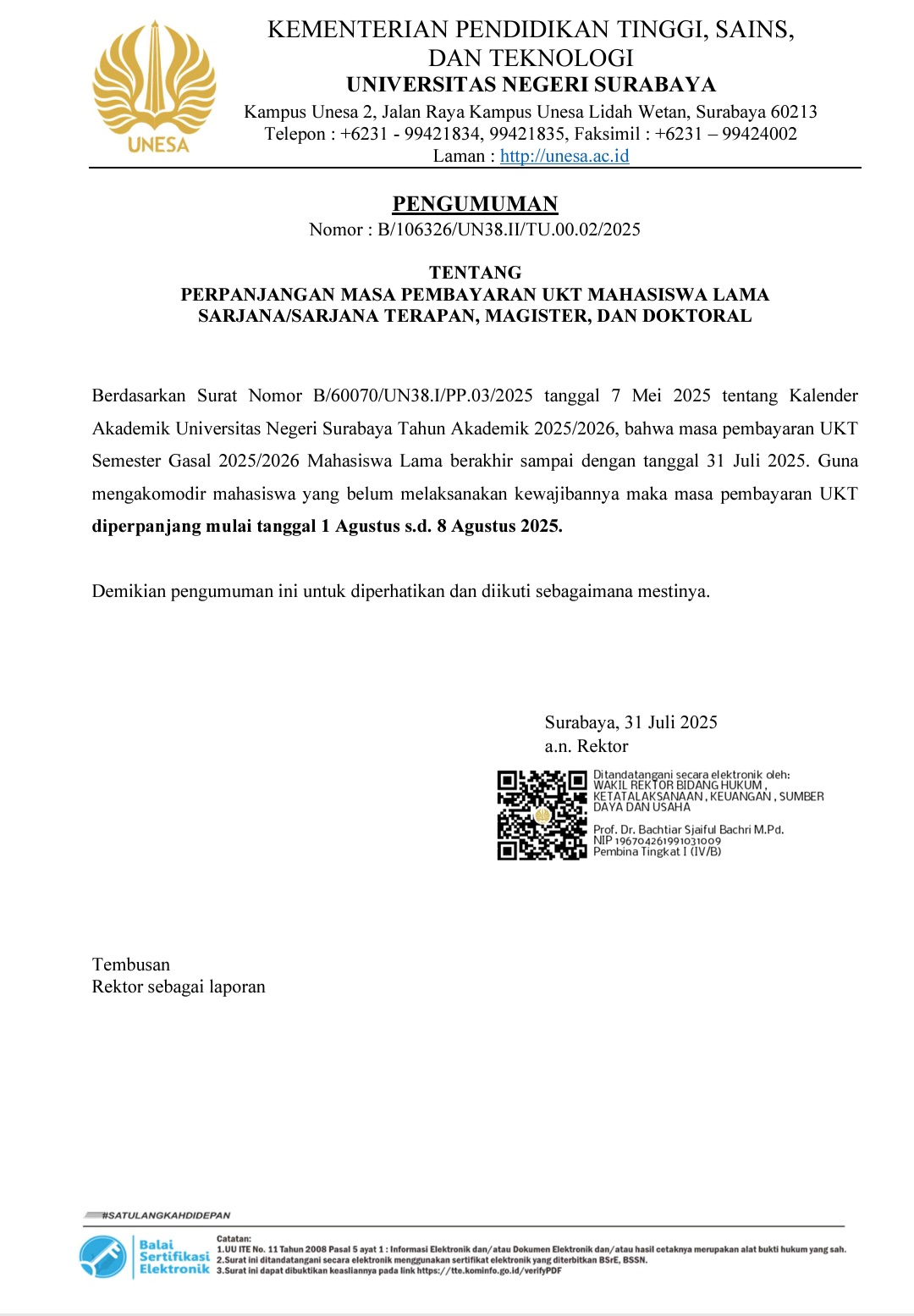 Universitas Negeri Surabaya (Unesa) memberikan perpanjangan masa pembayaran UKT bagi mahasiswa lama Semester Gasal Tahun Akademik 2025/2026.