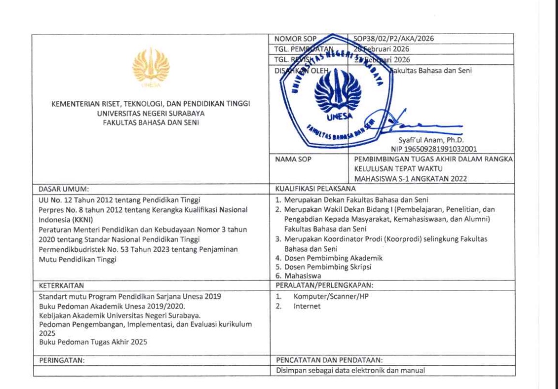 Program Studi Pendidikan Bahasa Jerman Fakultas Bahasa dan Seni Universitas Negeri Surabaya terus berupaya meningkatkan kualitas layanan akademik bagi mahasiswa, salah satunya melalui penerapan Standar Operasional Prosedur (SOP) Pembimbingan Tugas Akhir dalam rangka kelulusan tepat waktu mahasiswa S-1 angkatan 2022. SOP ini mulai diberlakukan pada 26 Februari 2026 dan menjadi pedoman dalam pelaksanaan bimbingan skripsi di lingkungan fakultas. Melalui SOP tersebut, mahasiswa Prodi Pendidikan Bahasa Jerman didorong untuk secara aktif mengatur jadwal bimbingan dengan dosen pembimbing melalui sistem akademik yang tersedia. Proses bimbingan dilakukan secara rutin dan terjadwal minimal satu kali dalam seminggu, serta seluruh kegiatan bimbingan dicatat dalam logbook pada sistem SIPINTAR sebagai bentuk monitoring akademik.